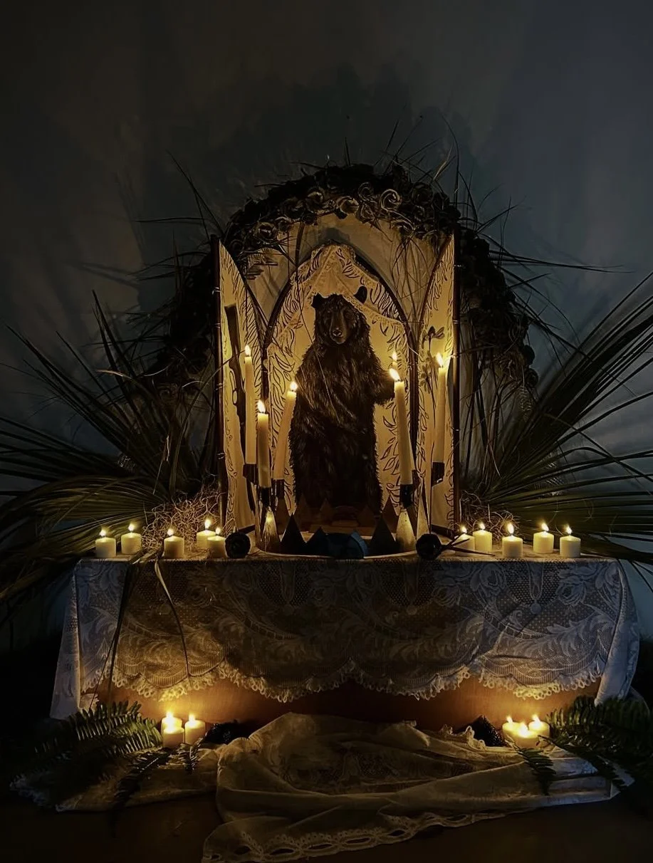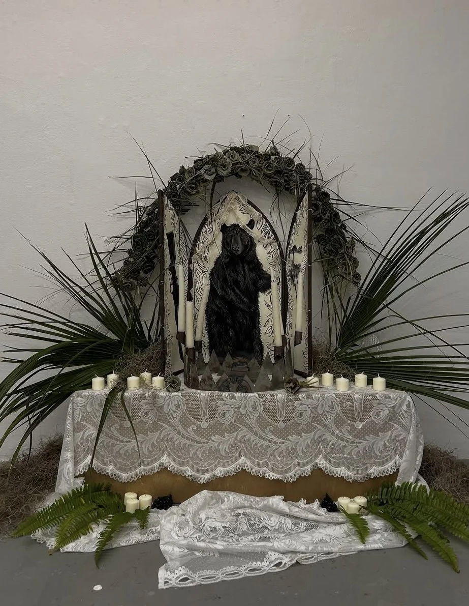 A palmetto arch of carefully folded roses and a spray of leaves burst out from the sides, framing a three panel structure. The triptych is warmly lit by tea lights and taper candles, held by the loops of the metal sheet bear trap that sits as an offering below an ornate painting of the Florida black bear at the center. Dried flowers decorate the right side of the panels, while a gun is painted on the other. Lace adorns the structure and bushels of Spanish moss cover its surface, giving it an effect of a ritual found in the depths of a forest.