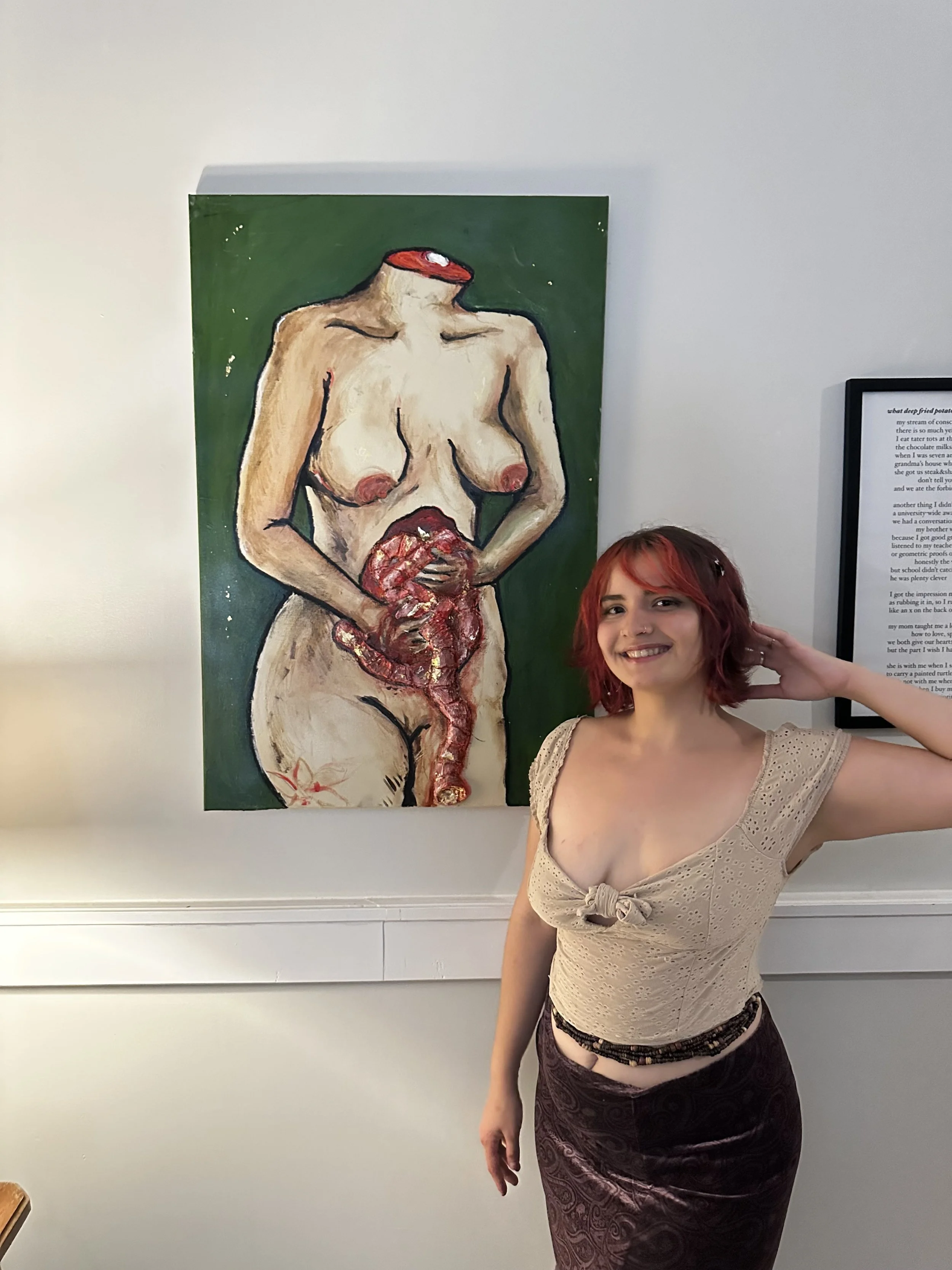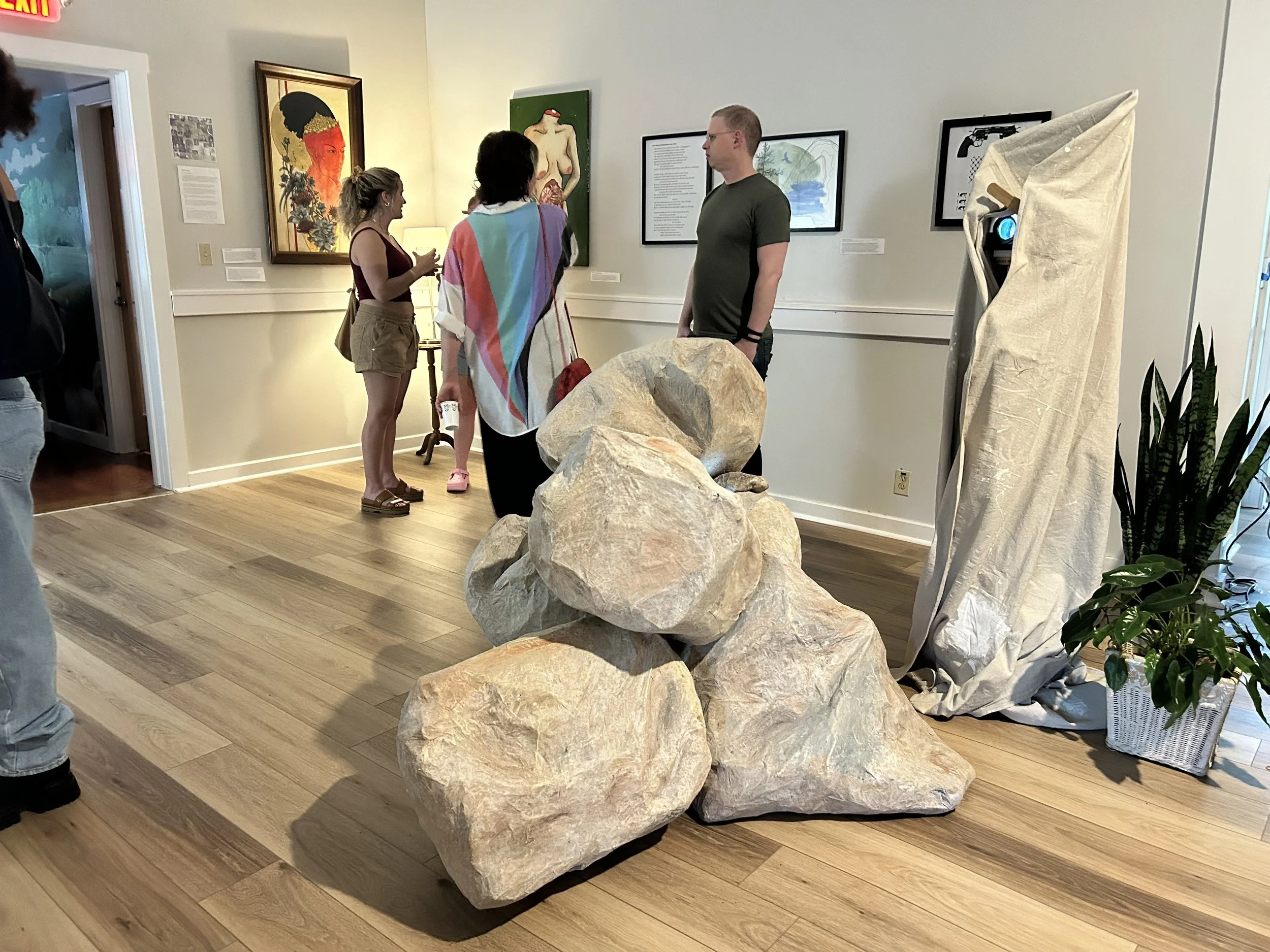 Small groups gathered around standout works like Elmira Yousefi’s You Can’t Just Leave a Mountain Behind, a sculpture featuring an iPad nestled inside a jagged rock. Across its screen, a text exchange played on loop between a mountain and her obsessive admirer. Nearby, Autumn Rose Barksdale’s Notes on Trans Women—a love poem projected on one wall—filled the room with vivid language and emotional force, a reminder of the power in unapologetic expression. The show also introduced new voices, like Alanis Gonzalez, whose Oops I lost my head! Sorry I spilled my guts :( depicted a disemboweled self-portrait, reinforcing the night’s themes of endurance and emotional survival. Pieces by other local artists—including Jessica Clermont, Maxine Worthy, and L.A.-based artist Kait Hartman, along with Puerto Rico-based artist Arlene Morillo—deepened the show’s narrative.